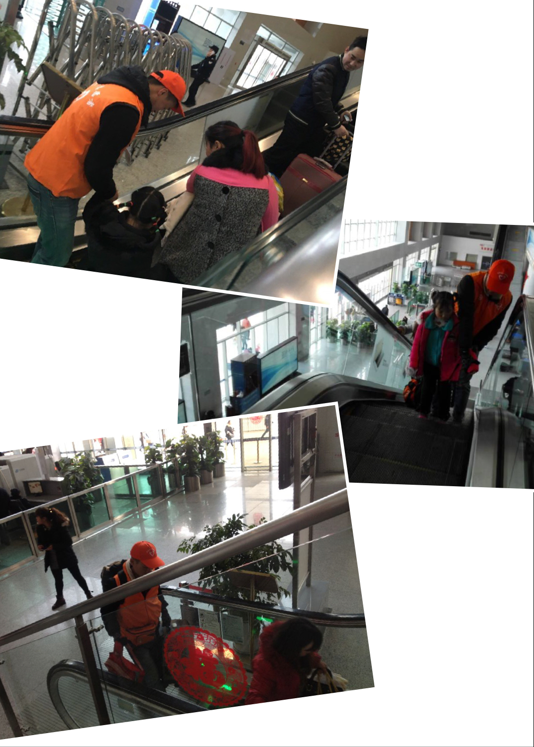 “注意脚下,小心安全!”候车厅前,一位帅气小伙子正在电梯口,只见他,一边审视着进站的队伍,一边时刻不忘提醒旅客注意脚下安全,遇到行李很多的旅客还要帮把手,提行李,动作迅速而娴熟,声音洪亮有力,“小伙子,谢谢你!”一位老大爷接过他提好的行李,给他竖起大拇指,“我是吴剑,很高兴为您服务”,他笑答道,橘色的身影在阳光的照耀下显眼异常。