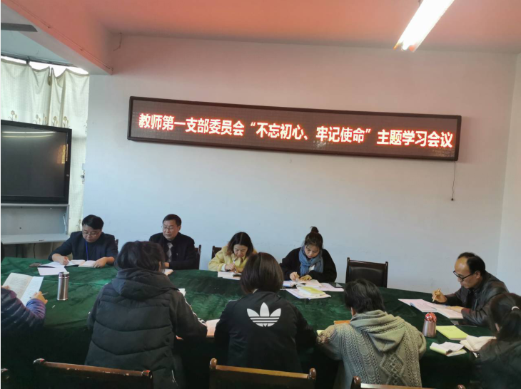 2019年11月14日下午,教师第一支部委员会召开了“不忘初心、牢记使命”主题学习会议。李文华同志组织全体党员同志原文学习了《习近平关于“不忘初心,牢记使命”论述摘编》第九章《加强学习,深入开展调查研究,全面增强执政本领》内容。李文华同志带领全体党员同志逐条学习了第九章全部36条论述摘编内容。并结合学校教育教学工作实际一一开展解读。