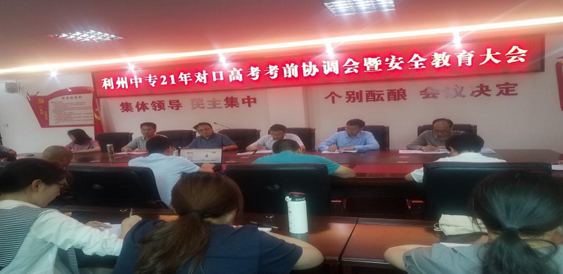 为确保我校学生顺利参加高考,2021年高考工作的顺利完成,我校于2021年6月2日在学校行政楼四楼会议室召开了“利州中专2021年对口高考考前协调会暨安全教育大会”,学校党委书记杜建新、副校长赵刚出席会议,会议由赵刚同志主持。