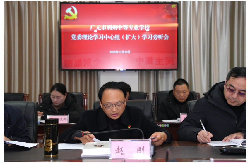 12月30日,利州中专党委理论学习中心组举行集体学习(扩大)旁听会,围绕深入学习贯彻党的二十届四中全会精神及《习近平谈治国理政》第五卷“进一步全面深化改革”进行学习研讨。市委教育工委委员、市教育局党组成员、副局长杨元,市教育局职业与成人教育科科长黄雄心,市教育局政策法规与综合改革科科长兰莉芬,川北幼儿师范高等专科学校党委委员、宣传部部长宋清君列席旁听。学校党委书记赵刚主持会议并讲话,党委班子成员参加学习并作交流发言。