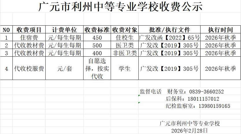 广元市利州中等专业学校收费公示