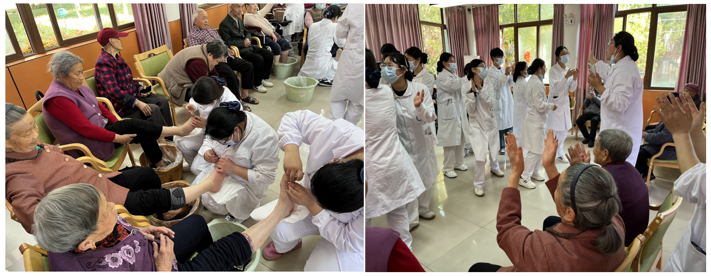 活动现场暖意氤氲、温情涌动,每一处细节都彰显着党员的初心使命与医者的仁心大爱。健康关爱环节中,2022级高职护理班学生立足专业所长,将课堂所学转化为实践服务,切实践行“白衣天使”的责任与担当。同学们秉持耐心、细心、贴心的服务理念,为老人们提供专业的按摩舒缓、中药泡脚等康养服务,细致为老人修剪指甲、整理仪容,全程轻声问询老人身体状况,细致了解日常起居需求,用扎实的专业技能缓解老人的身体疲惫,用温柔的陪伴驱散老人的身心不适,让老人们在春日里感受到细致入微的健康关怀与亲人般的温暖。